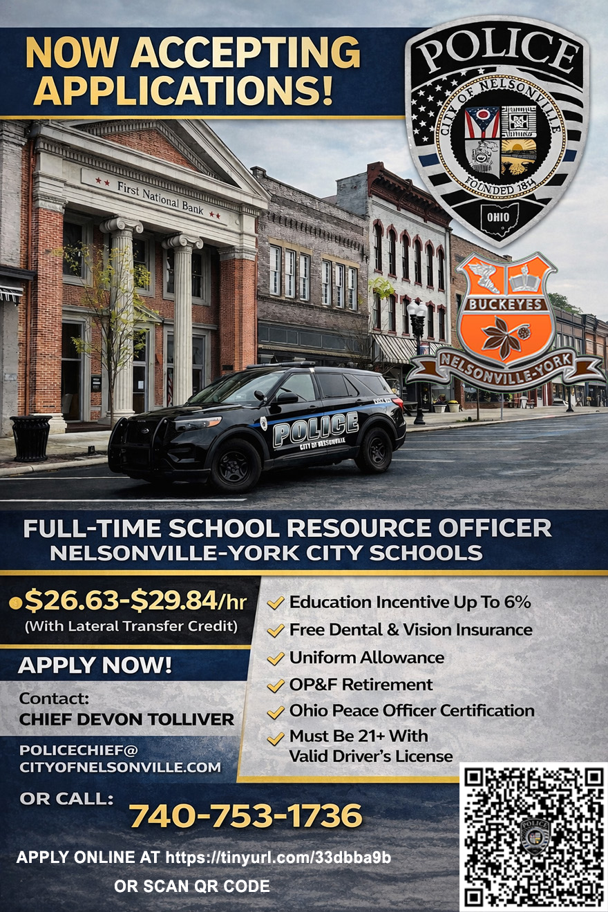 The Nelsonville Police Department is accepting applications for the position of School Resource Officer with the Nelsonville-York City School District. Applications will be accepted until 3:00PM on Friday, May 1, 2026. The city is working on setting up a Civil Service Exam for the position.