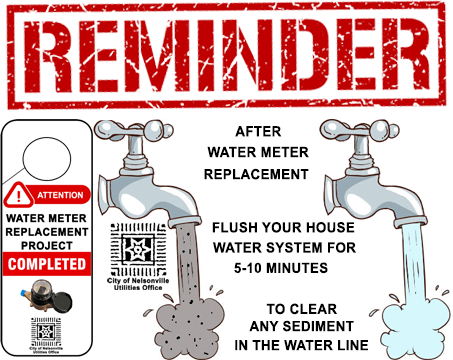 Once your water meter is replaced each customer location will be marked with a door hanger. It is recommended water customers flush their home water system for 5 to 10 minutes after the new water meter is installed. By running your water system for 5 to 10 minutes, it will clear any sediment from your water lines. This is best done by using an outside spigot or your bathtub. DO NOT use a sink faucet because they have filter screens. Individual water meter replacements in Nelsonville should only take about 15 minutes per meter.