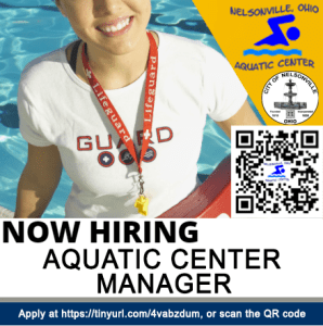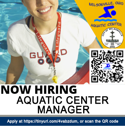 The City of Nelsonville is seeking applications for the City’s Aquatic Center Manager. The Aquatics Center Manager oversees the daily operation of the Nelsonville Aquatics Center. The daily operation includes but is not limited to open swim times, lap swimming, learn to swim program, parties/special events, and aqua aerobics. Aquatics Center Manager position is a seasonal position.