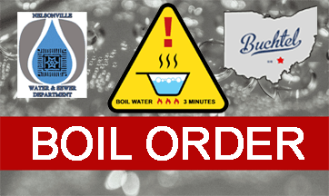 The Nelsonville Water Department has issued a boil order for water customers on Bessemer Road from the intersection of Woodlane Drive and Carbon Hill Road to Buchtel, State Route 78 from the intersection of Sylvania Avenue and State Route 78 to Buchtel and all the Village of Buchtel. The Nelsonville York City School Complex IS NOT INCLUDED in this boil order. The boil order will be in effect until 12:00PM, Friday, September 22, 2023, unless notified otherwise. This boil order is due to a water line break and repair.