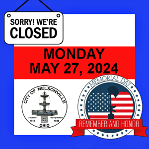 Nelsonville City offices closed Mon, 5/27/24, for Memorial Day holiday, re-open Tue, 5/28/24, for regular business hours May 21, 2024May 21, 2024nelsonvillecity The City of Nelsonville announces that all City offices will be closed on Monday, May 27, 2024, in observance of the Memorial Day holiday. City offices will re-open for business on Tuesday, May 28, 2024, for regular business hours. Share this: Click to share on X (Opens in new window) X Click to share on Facebook (Opens in new window) Facebook Like Loading... Related