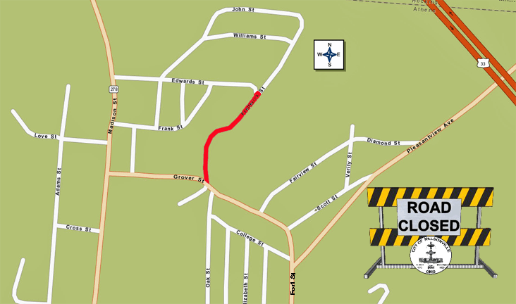 The City of Nelsonville announces that Fredrick Street, from Grover Street to Edwards Street will be closed to traffic tomorrow at 9:00AM, Wednesday, June 19, 2024, until 9:00AM, Thursday, June 20, 2024. The closure is to prepare the water main tie over trench for paving. Please avoid this area and use an alternate route.