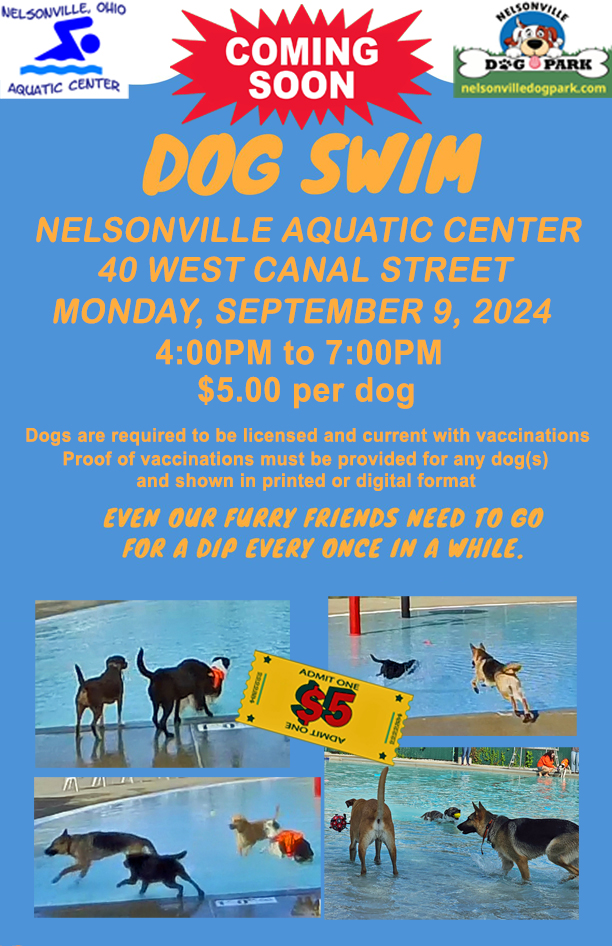 Just a reminder, the Nelsonville Aquatic Center is sponsoring a Dog Swim in less than a week. The event will benefit the Nelsonville Dog Park. The Dog Swim is Monday, September 9, 2024, from 4:00PM until 7:00PM. $5.00 per dog to enter; larger donations are welcome: all proceeds to aid in establishing a Nelsonville Dog Park. Bring your dogs to romp and play and swim. Dogs, Fun and water – you can’t have a better time than that!
