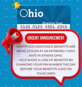 The Athens County Department of Job and Family Services customers experiencing skimmed benefits or loss of benefits can stop at any of the agency’s locations for paperwork to assist in reporting and recovering the benefits.