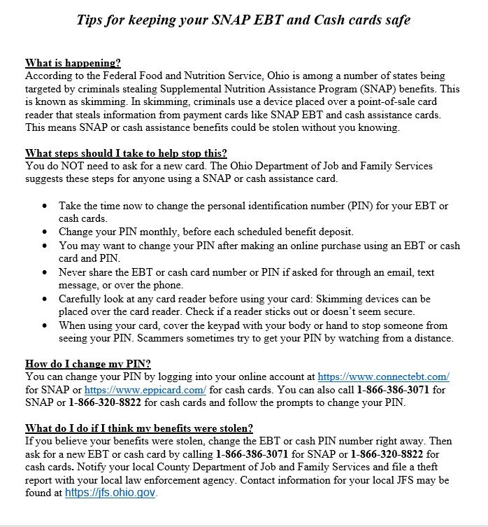 The Ohio Department of Job and Family Services recommend you immediately—and regularly—change your PIN by going to your SNAP or cash assistance benefits page, or by calling 1-866-386-3071 for SNAP and 1-866-320-8822 for cash cards. Follow the prompts to change your PIN. Again, be aware of criminals using skimming to steal your EBT card information and consider changing your PIN by going to your benefits page, or by calling 1-866-386-3071 for SNAP and 1-866-320-8822 for cash cards and following the prompts to change your PIN.