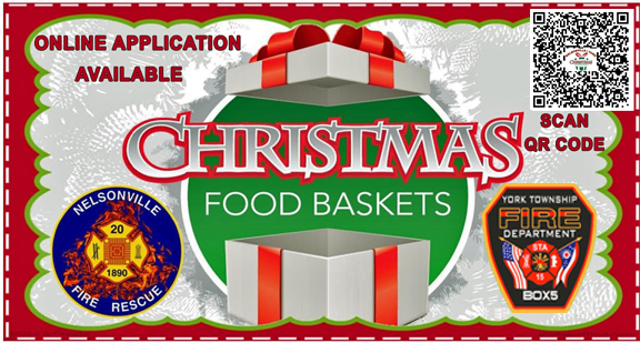 2024 Nelsonville/ York Christmas Basket applications will be available at the Nelsonville Fire Department or Water Department and online starting Friday, November 29, 2024. To apply online go to https://tinyurl.com/46akcuuz, to safely complete and submit an application. You can also scan the posted QR code to access the site on a smartphone.