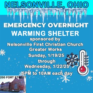 The City of Nelsonville announces that Greater Works and the Nelsonville First Christian Church will be opening an overnight emergency warming shelter at the church located at 200 Fort Street in Nelsonville. The overnight emergency warming shelter will be open Sunday, January 19, 2025, through Wednesday, January 22, 2025, from 5:00PM to 10:00AM each day.