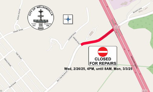 The City of Nelsonville announces that Burr Oak Boulevard between Hillside Drive and the US 33 overpass will be closed to vehicle traffic starting today Wednesday, February 26, 2025, at 4:00PM, until 8:00AM, Monday, March 3, 2025. The closure is for repairs to the roadway after the installation of new sanitary sewer lines.