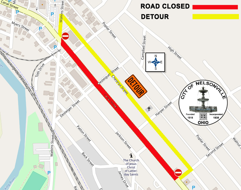 The City of Nelsonville announces that the Canal Street construction project will continue Monday, July 7, 2025. The second section of concrete and paving will be to East Canal Street from Watkins Street to 2nd Street. The roadway will be closed to all traffic. A detour has been established using Watkins Street, Chestnut Street and 2nd Street.