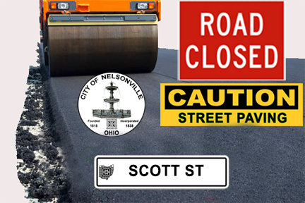 The City of Nelsonville announces that Scott Street will be closed, Friday, August 8, 2025, from 7:00AM until 5:00PM, for street repaving. Vehicle traffic will be detoured to Pleasantview Avenue and traffic controlled by traffic lights on Fort St and Pleasantview Avenue.