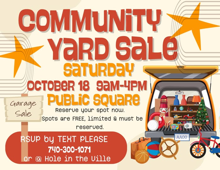 The City of Nelsonville announces that the Public Square will be closed to traffic Saturday, October 18, 2025, at 7:00AM until 6:00PM for a community yard sale. There will be no parking allowed on the Public Square starting at 6:30AM, Saturday, October 18, 2025. Unauthorized cars will be towed away at the owner’s expense. Please avoid this area and use an alternate route.