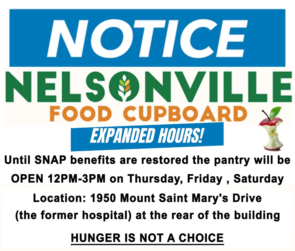 The Nelsonville Food Cupboard is located at 1950 Mount Saint Mary’s Drive (the former hospital) at the rear of the building.