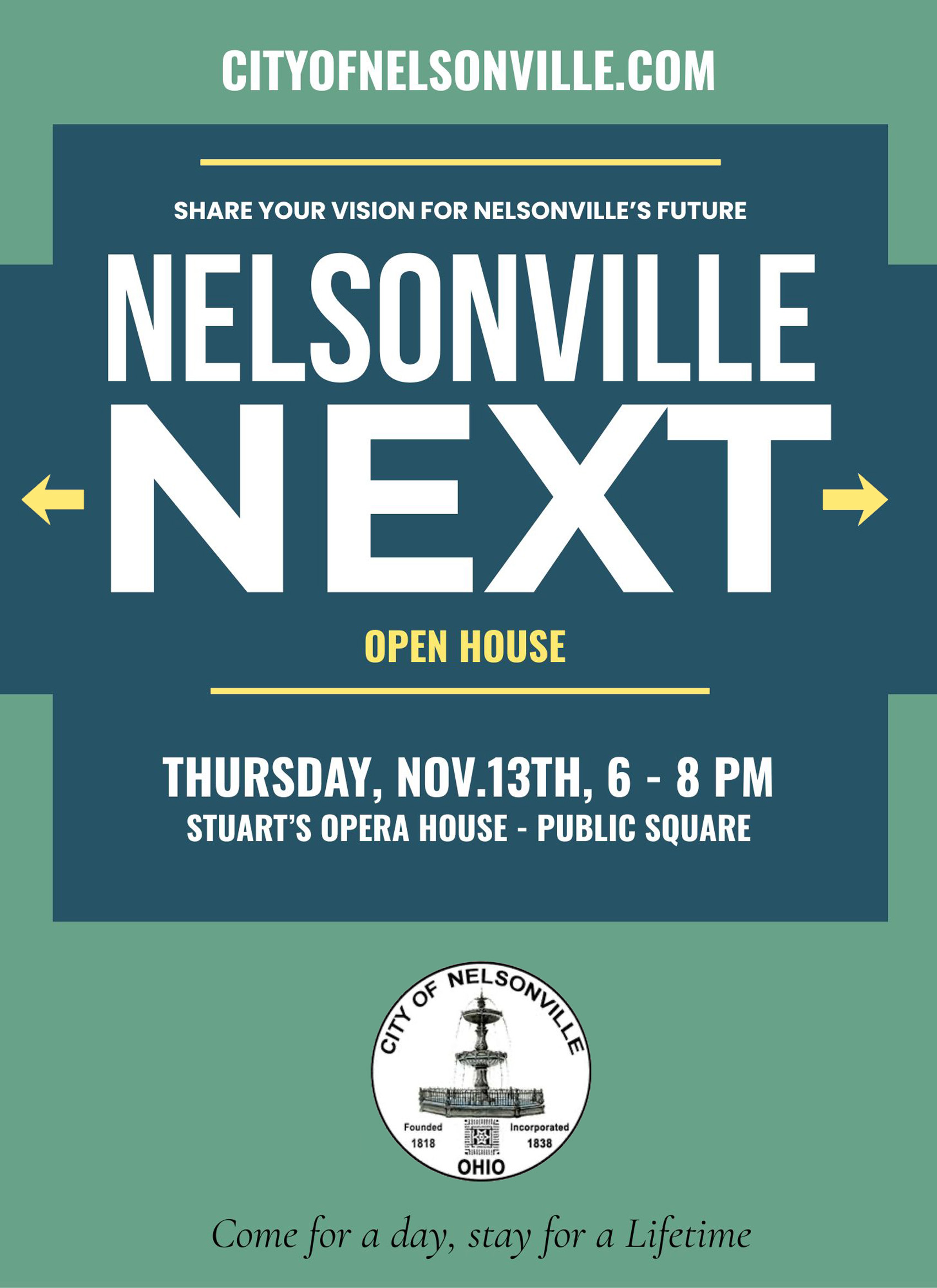 Local residents will have the opportunity to answer those questions — and help shape the next chapter of Nelsonville’s story — at a Nelsonville Next Open House on Thursday, November 13, from 6:00 to 8:00 p.m. at Stuart’s Opera House on the Public Square.