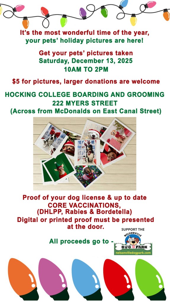 The Nelsonville Dog Park Board and Hocking College Boarding & Grooming are holding a holiday pet picture fundraising event. Get your pet’s picture taken for the holidays on Saturday, December 13, 2025, from 10:00AM until 2:00PM. The event is being held at the Hocking College Boarding & Grooming facility located at 222 Myers Street in Nelsonville, across the street from McDonalds on East Canal Street. Pictures cost a donation of $5.00, larger donations are also welcome. All proceeds will go to support the Nelsonville Dog Park.