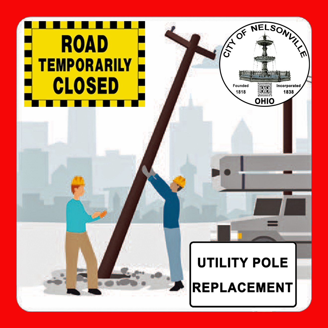 The City of Nelsonville announces that 5-Star Electric (Contracted by AEP) will be working on replacing utility poles along Adams Street starting today, Monday, January 5, 2026, and will continue through Thursday, January 8, 2026. During work Adams Street may be closed to vehicle traffic for small periods of time. Please avoid this area and use an alternative route.
