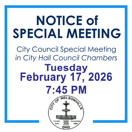 The Nelsonville City Council will hold a special meeting on Tuesday, February 17, 2026, at 7:45 PM, at City Hall. The meeting has been called to discuss and take possible action on the following items,