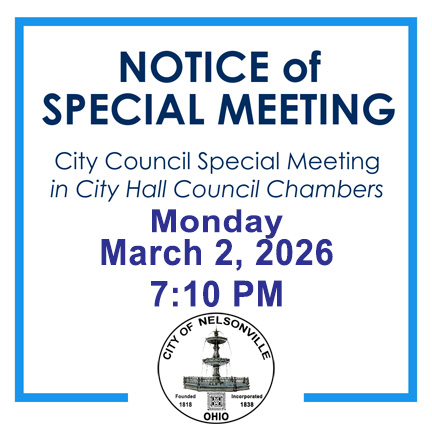 The Nelsonville City Council will hold a special meeting on Monday, March 2, 2026, at 7:10 PM, at City Hall. The meeting has been called to discuss and take possible action on the following items,