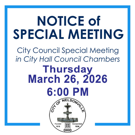 The Nelsonville City Council will hold a special meeting on Thursday, March 26, 2026, at 6:00 PM, at City Hall. The meeting has been called to discuss and take possible action on the following items,