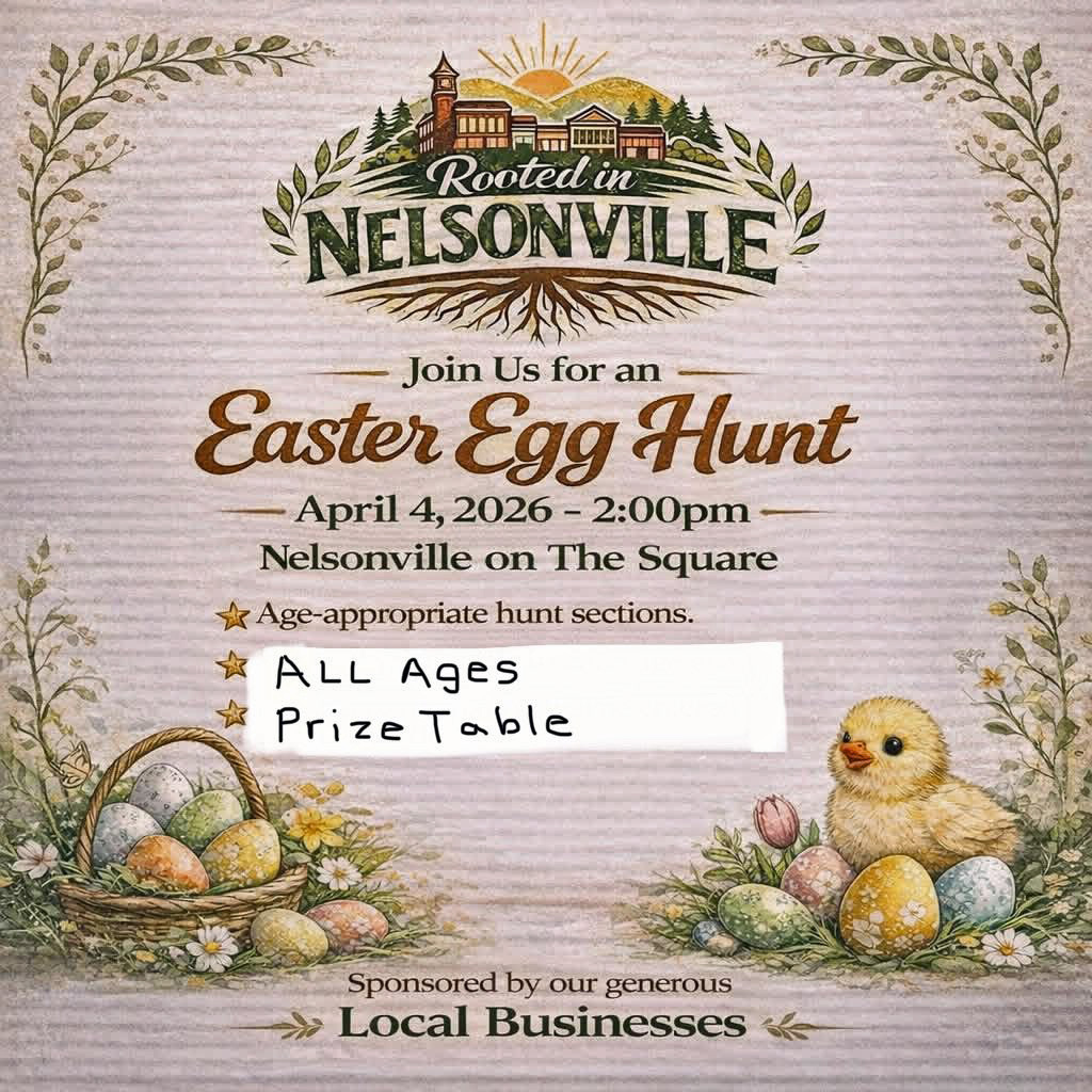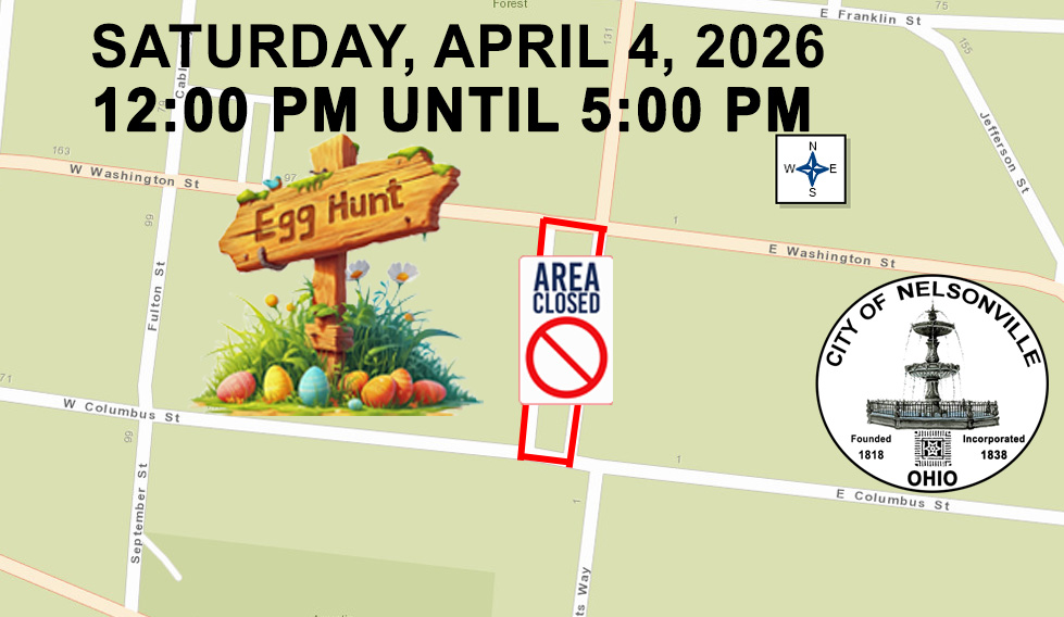 The City of Nelsonville will be CLOSING the Public Square and the adjoining sections of Washington Street and Columbus Street on Saturday, April 4, 2026. The streets will be closed and barricaded from 12:00 PM until 5:00 PM for the Rooted in Nelsonville Easter Egg Hunt.