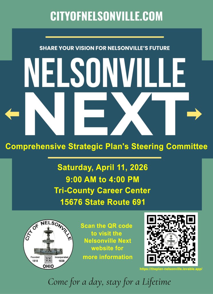 The Nelsonville Next Comprehensive Strategic Plan’s Steering Committee will hold a plan development workshop meeting on Saturday, April 11, 2026, from 9:00 AM to 4:00 PM at Tri-County Career Center, at 15676 State Route 691. This will be a public meeting, and anyone who wants to participate in the process of developing the plan recommendations is invited and encouraged to attend.