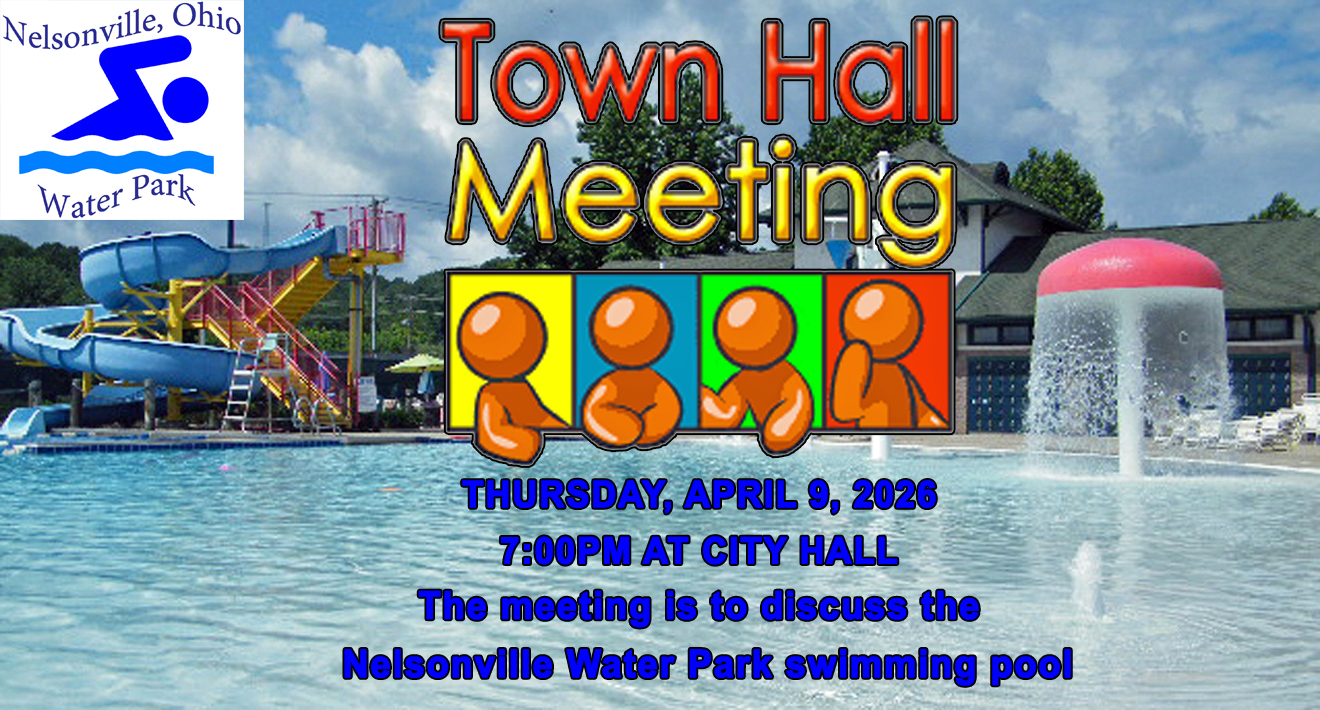 The City of Nelsonville will hold a town hall meeting on Thursday, April 9, 2026, at 7:00 PM, at City Hall. The meeting has been called to discuss the Nelsonville Water Park swimming pool.