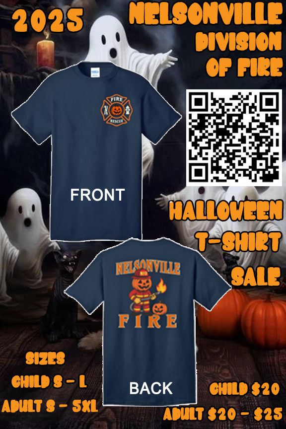 The Nelsonville Division of Fire is now taking orders for the 2025 NFD Halloween T-Shirt. All proceeds raised will go toward funding purchasing Halloween candy, and for fire safety training materials to be used in the schools. These shirts are a cotton blend NOT 100% cotton