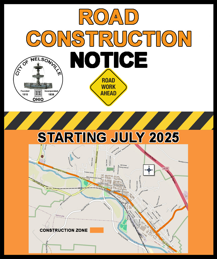 Notification of upcoming road construction project this summer that may affect you. The City of Nelsonville will be paving and redoing concrete on the following streets,