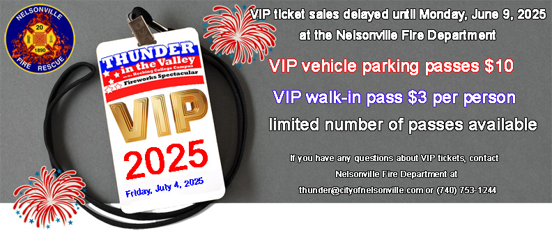 VIP ticket sales for 2025 “Thunder In The Valley” fireworks spectacular have been delayed until Mon, 6/9/2025, questions about VIP tickets, contact thunder@cityofnelsonville.com or (740) 753-1244