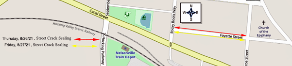 The City of Nelsonville announces that street crews will be performing street crack sealing on Fayette Street on Thursday August 26, 2021, and Friday August 27, 2021.