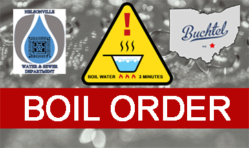 The City of Nelsonville has issued a boil order for the affected areas in Nelsonville until 12:00 PM Sunday, December 14, 2025. When a boil order is in effect, we ask all who are affected to boil their cooking and drinking water for three (3) minutes before being consumed.
