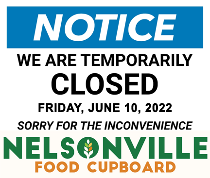 Nelsonville Food Cupboard closed Fri, 6/10/22, due to roadway construction, will be open Sat, 6/11/22