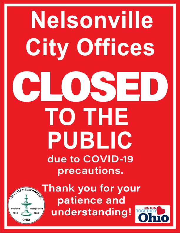 Due to increasing cases of COVID-19 in Athens County and Ohio, the City of Nelsonville is modifying City operations to mitigate the spread of the virus. The City will continue to conduct business as usual but the Nelsonville City building and complex will be closed to the public except by appointment or emergency, we ask that our residents contact us via telephone, or e-mail, to keep any exposure to a minimum. Nelsonville Public Safety departments will continue to provide services.