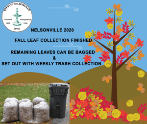 The City of Nelsonville announces that the fall leaf collection has been finished for 2020 due to mechanical problems with equipment. If you still have leaves that need picked up, they must be bagged and set out with your weekly trash for pick up. Thank you for your understanding and assistance.