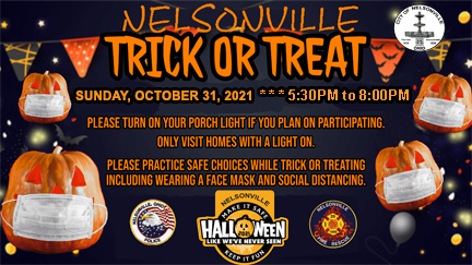 The City of Nelsonville announces that Trick-Or-Treat; Beggar’s Night will be held on Sunday, October 31, 2021, from 5:30PM to 8:00PM.