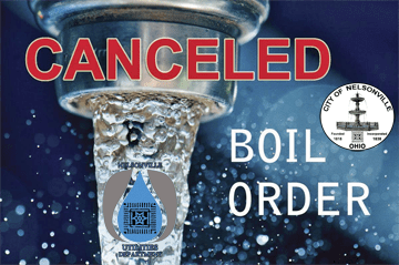 The Nelsonville Water Department has CANCELED the boil order for Fort Street from Franklin Street to Grover Street, Short Street, Kontner Street, Mill Street, Poling Avenue, Pleasantview Avenue, Diamond Street, Verity Street, Fairview Street, Scott Street, College Street, Elizabeth Street, Oak Street, Lancaster Street, and Clinton Street. Thank you for your patience and understanding during this incident.